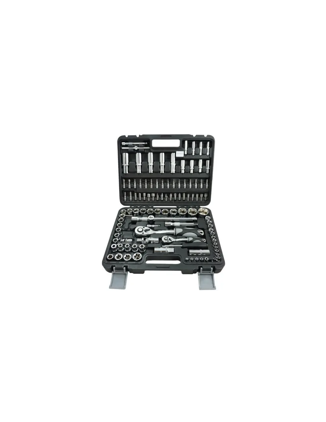 Juego de vasos de 110 piezas con 72 dientes, ideal para profesionales y aficionados al bricolaje. Incluye vasos de 1/4″ y 1/2″ junto con puntas TORX-SEG. Ofrece versatilidad y precisión en una amplia gama de aplicaciones. Perfecto para mecánica, automoción, construcción y tareas de mantenimiento.