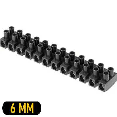 Regleta de conexión de 6mm en color negro. Ideal para realizar conexiones eléctricas de forma segura y ordenada. Perfecta para trabajos profesionales y domésticos. Facilita la unión de cables y asegura una transmisión de corriente óptima. Su diseño compacto permite su uso en espacios reducidos.